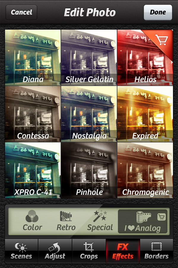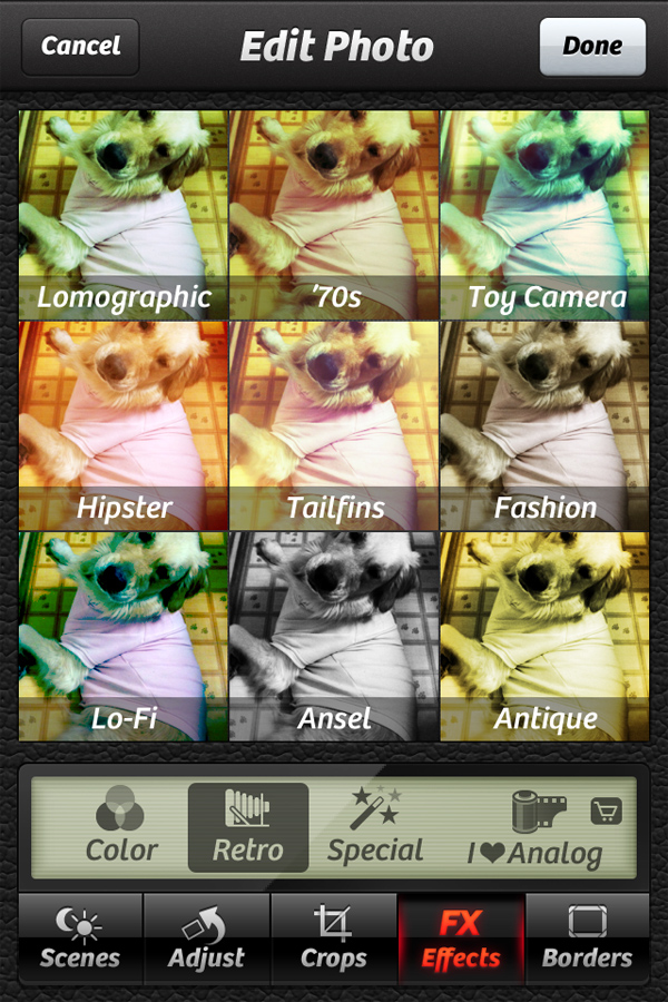 下段・右から2番目の“FX Effects”をタップすると、4カテゴリ36種類のフィルターでエフェクトをかけることができます。左側の画像は“Retro”を、右側の画像は“I♥Analog”というカテゴリのエフェクト一覧です。それぞれ、ぜんぜん雰囲気が違うでしょ? こうして一覧で見ると、色味の変化がよくわかって面白いですよね。これらのエフェクトは、プロの写真家とコラボレーションして制作されているそうです。