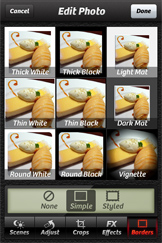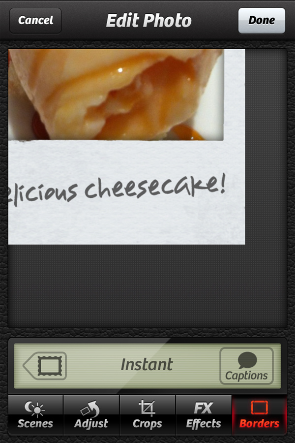 下段・右の“Borders”をタップすると、2カテゴリ18種類の中からフレームを選択することができます。好きなフレームを選んでタップすると、右下に“Captions”という表示が。ここをタップすると、写真のキャプション(一言説明文)や日付などを入力することができちゃうんです! フレームごとに文字のフォントが変わるので、雰囲気にピッタリな文字でキャプションを入れることができますよ。