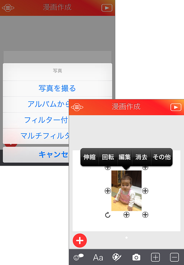 今回はiPhone版で解説しますね。アプリを起動すると、『コスモストリーム』と呼ばれるコミュニティスペースが表示されます。コスモストリームには、「無料マンガ共有COSMO(コスモ)」を使って作ったオリジナルの漫画作品を投稿することができ、ユーザー同士での評価やコメントで交流することができます。共感を呼ぶ感情漫画、4コマなどのお笑い漫画、ニュース漫画、画像まとめ漫画など多種多様な投稿作品は[ピックアップ][新着][人気]でソートできるので、気になる漫画をチェックしてみましょう。いろんな作品を見ていると、自分でも作ってみたくなりますね。それではさっそく漫画を作ってみましょう!画面右上のボタンをタップすると、[漫画作成]画面が表示され、白のスペースが表示されます。画面下部のアイコンは左から、[スタンプ][テキスト][ペイント][写真][ページを追加][ページを削除]というメニューになっています。今回は写真を使ったおもしろ漫画を作りたいので、カメラアイコンの[写真]をタップ。その場で撮影する[写真を撮る]、スマートフォンに保存されている写真を使う[アルバムから選ぶ]、フィルターを使って撮影する[フィルター付き撮影]、いくつものフィルターを組み合わせて撮影する[マルチフィルター撮影]が選べます。いずれかの方法で漫画に使う写真を選ぶと、白のスペースに写真が配置されます。写真をタッチして好きな位置に移動させましょう。写真の周囲に表示されている(+)マークをタッチしながら上下左右に動かすことで、写真のサイズを変えたり、回転マークをタップして写真を回転させることもできます。写真をタップすると[伸縮][回転][編集][消去][その他]のメニューが表示されます。[編集]では写真にペンで文字を書き入れたり、一部を切り取ったりできます。[その他]では写真をコピーしたり、配置された写真やスタンプの重なり順を変更することも可能です。