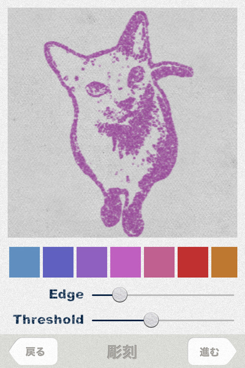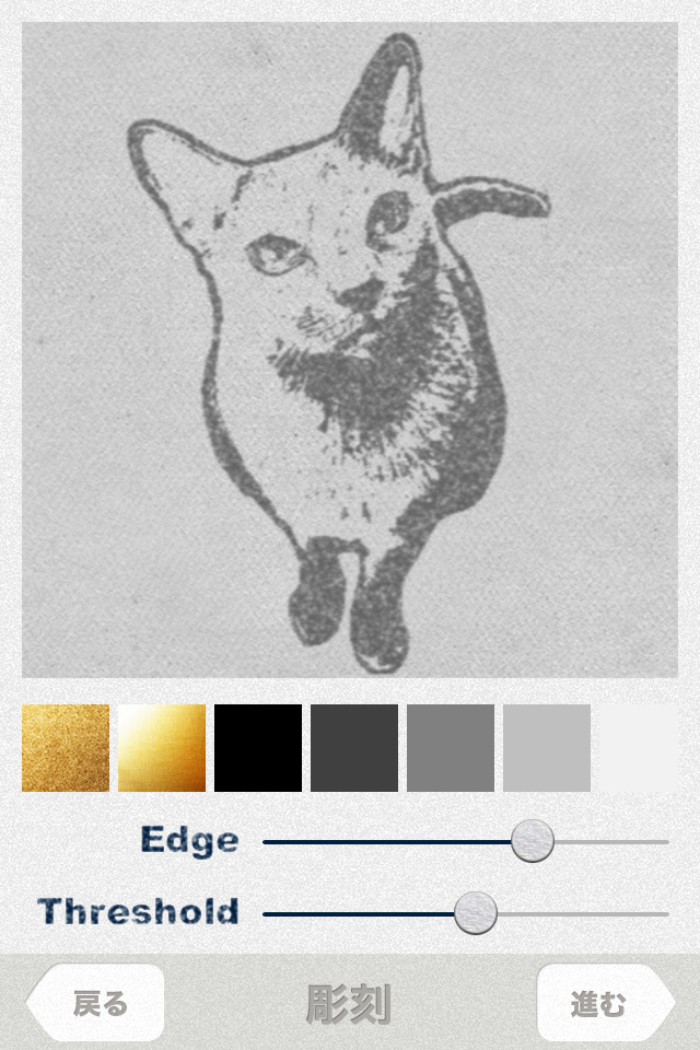 [Edge]のスライダーを左右に動かすことで、輪郭の太さを調整できます。[Threshold]では、インクで塗りつぶす画像の明るさの境界を調整します。[進む]をタップすると、[仕上げ]の画面に進みます。