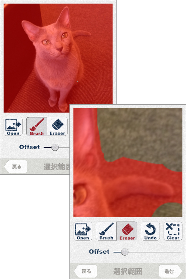 選択範囲を調整する場合は、[Eraser]をタップし、○で表示されるマーカーを動かして少しずつ消去していきます。スタンプにしたい部分を間違えて消してしまった場合は、[Brush]をタップして、その部分をなぞって選択し直しましょう。[Undo]をタップすると、5回まで操作の取り消しができます。二本指でピンチイン・ピンチアウトすると、拡大・縮小ができます。細かい部分を編集したいときに便利です。[Offset]のスライダーを左右に動かすと、マーカーの位置を調整することができます。位置を変えることで、マーカーが指で隠れて操作しづらくなるのを防ぎます。