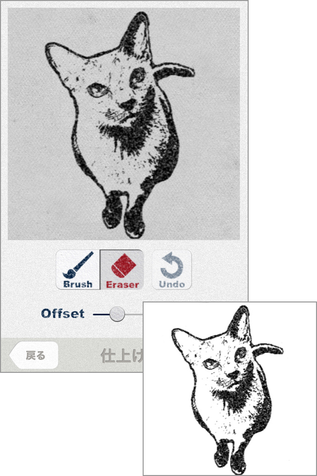 [仕上げ]の画面では、プレビューで確認した後でスタンプの不要な部分を消したり、必要な部分を塗り足すことができます。操作方法は、先ほどと同様です。
