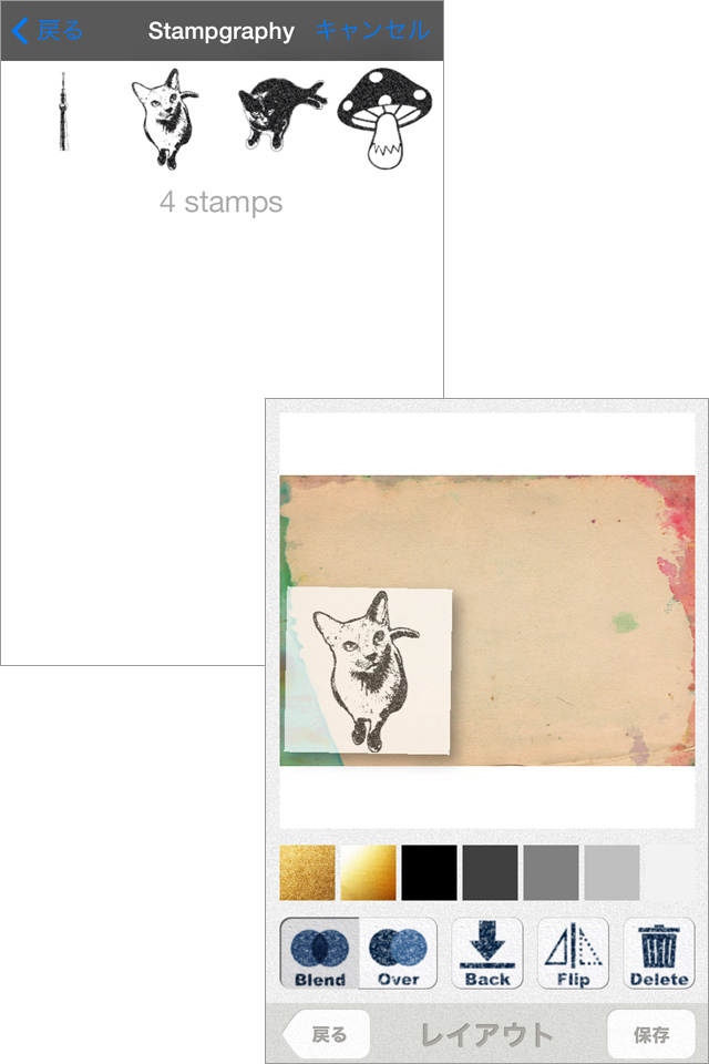 スタンプを押すときは、[Stamp]ボタンをタップ。スタンプ帳が表示されるので、押したいスタンプを選んでタップしてください。選択中のスタンプは画面から浮いた状態で表示されます。一本指タッチで移動、二本指のピンチイン・ピンチアウトで拡大・縮小、二本指で左右に動かすことで、回転させることができます。インクの色はカラー部分をスワイプすることで全117色から選ぶことができます。スタンプをもう一度タップすることで、選択中のスタンプを押すことができます。押されたスタンプをタップすると、再び選択状態に戻すことができます。