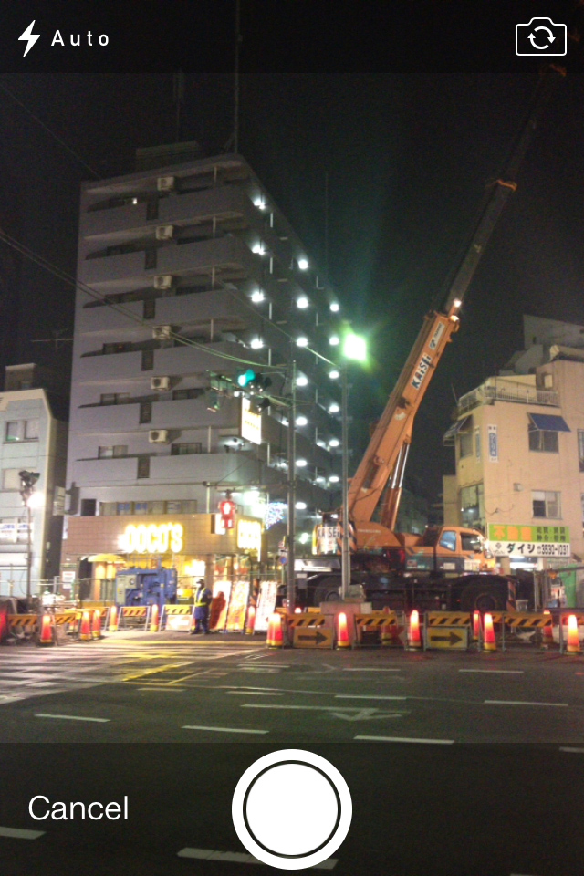 アプリを起動したら、すぐに撮影画面が表示されます。画面左上のフラッシュマークのタップでフラッシュの[Auto][On][Off]の切り替え、画面右上のカメラマークタップでメインカメラ/インカメラの切り替えができます。画面をタッチすると、オレンジ色の四角い枠が表示され、ピントを合わせることができます。また、画面を右にスワイプすると、ズームもできます。