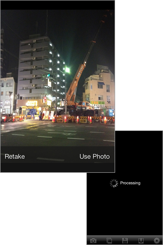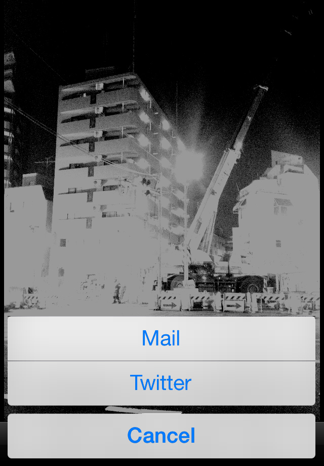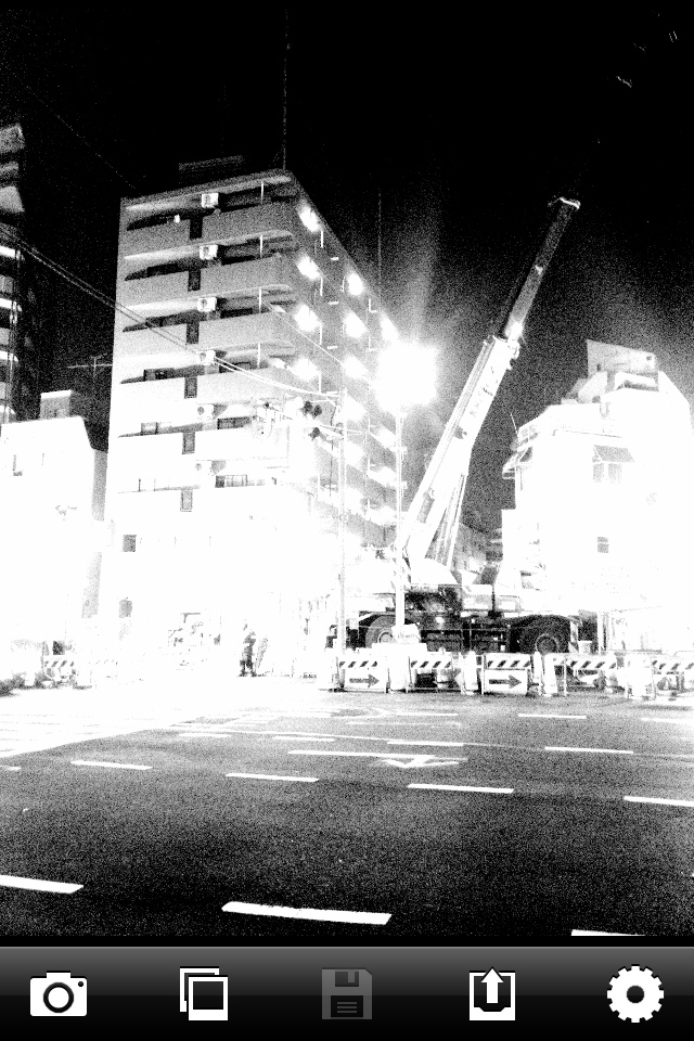 [Use Photo]をタップして少し待つと、撮影した写真がモノクロに加工されます。ただ単純にモノクロにしているのではなく、絶妙に調整されたコントラストで、光と影や物の質感が力強く表現されています。少し粒子が荒い、ザラリとした紙のような印象もポイントですね。ただの工事現場の写真も、なんだかアートのように見えてくる気がします。