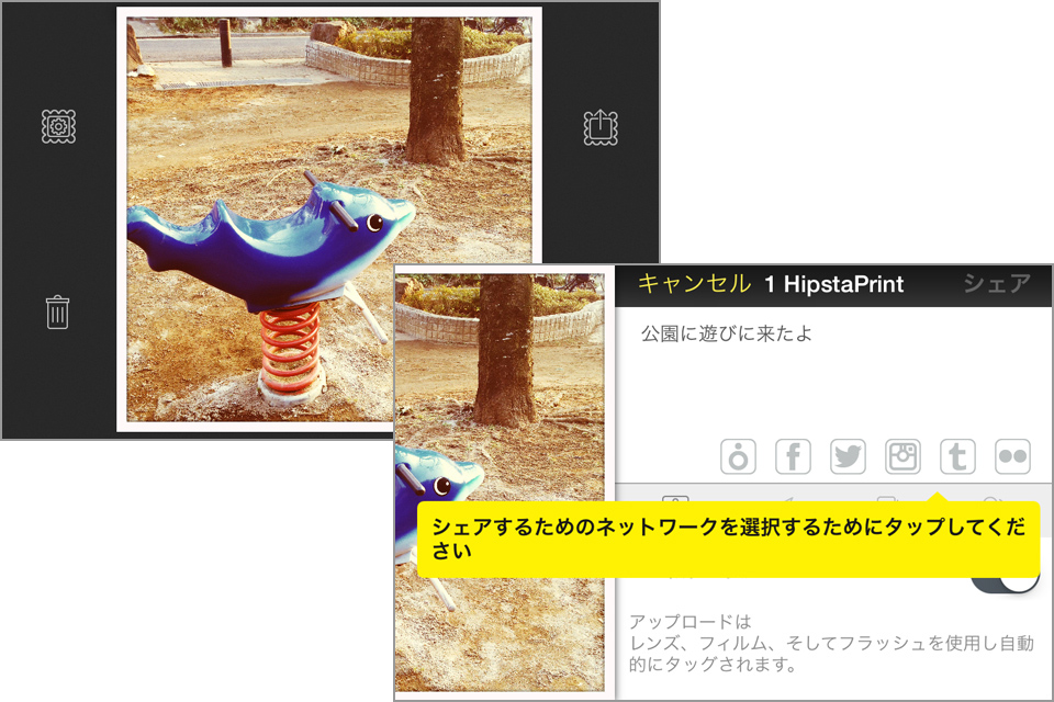画面右上が共有ボタンです。タップすると、共有画面が表示されるので、コメントを記入して、Facebook・Twitter・Instagram・Tumblrなど、共有したいSNSを選択して、共有しましょう。保存した写真がイマイチだった場合は、画面左下のゴミ箱ボタンで削除できます。
