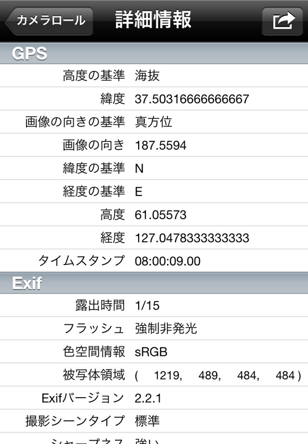 ファイルのタイプ・サイズから、画像の解像度、撮影場所の緯度・高度・経度、露出時間…など、写真の詳細情報は、こんなに細かく表示されちゃいます。また、右下の“オプションマーク”→“設定”をタップすると、位置情報の編集や保存ができるなどの拡張機能を使うこともできますよ。好きな音楽に合わせて、スライドショー表示しても楽しいです!