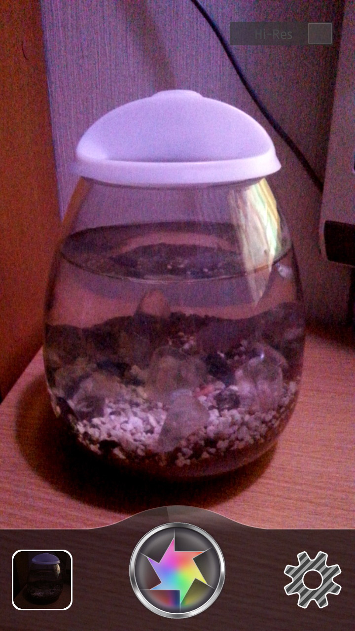 画面右上には[Hi-Speed]モードと[Hi-Res]モードの切り替えボタンが表示されています。[Hi-Speed]モードは短時間で撮影ができるので、手ブレをより少なくすることができます。[Hi-Res]モードは8枚の連続写真の撮 影に多少時間がかかりますが、自然な美しい仕上がりになります。