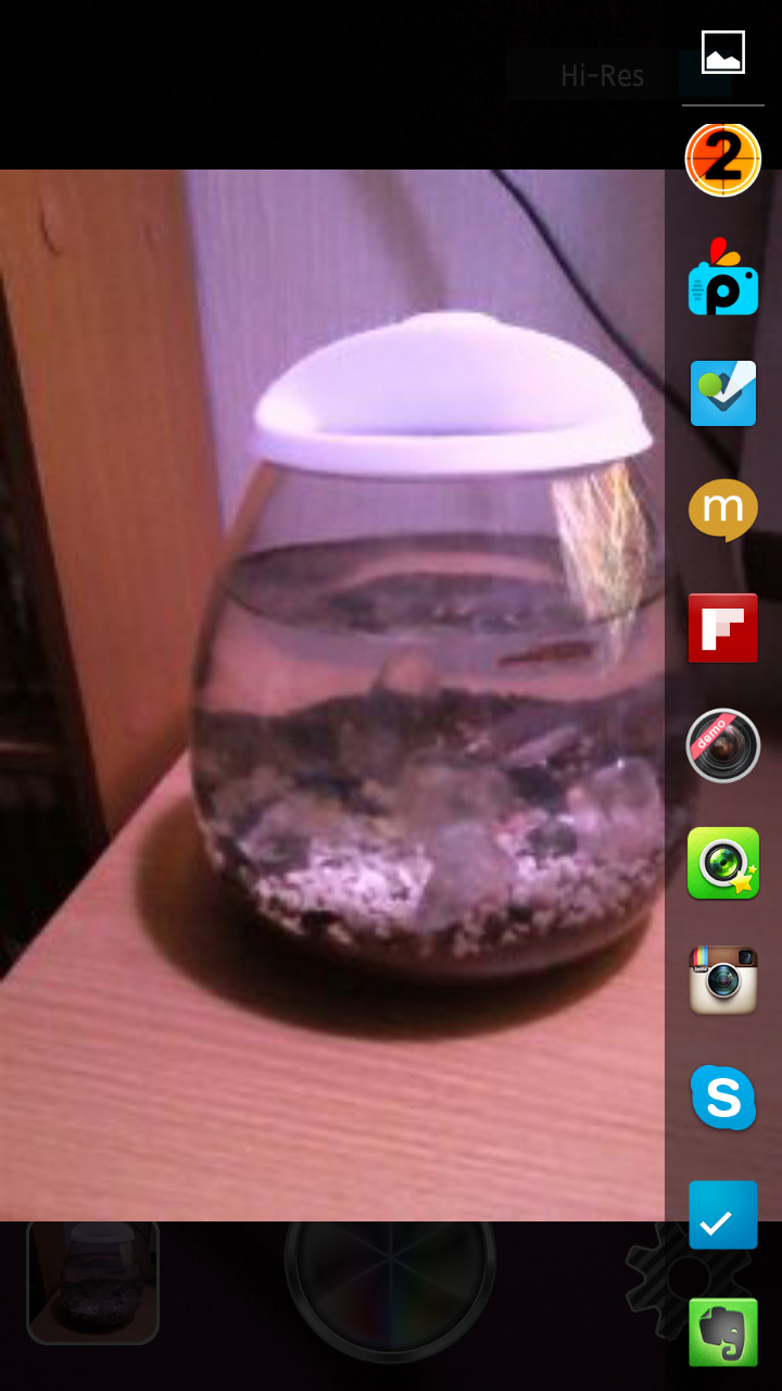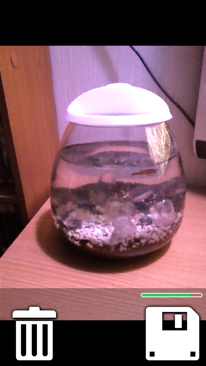 有料版の案内画面を閉じると、再度撮影画面に戻ります。画面左下のサムネイルに直前に撮影した写真が表示されます。タップすると、撮影した写真を確認できます。暗い室内とは思えないクリアで明るい写真が撮影できました!この確認画面では、他のアプリへのシェアもできます。