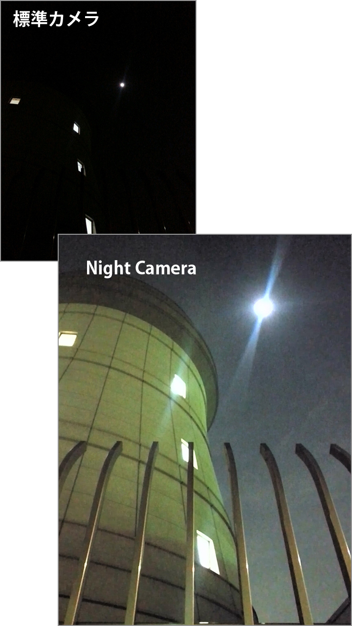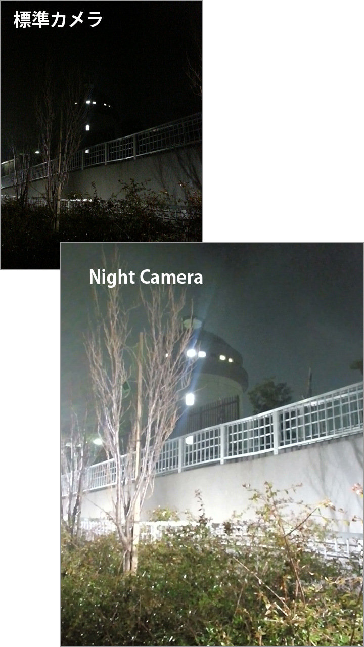 今度は夜景を撮影した写真を見てみましょう。同じ場所を標準カメラ(フラッシュ不使用)で撮影した写真と、「Night Camera」で撮影した写真との比較画像です。標準カメラでは、真っ暗で何が写っているのかもよくわからない写真ですが、「Night Camera」で撮影した写真には、くっきりと風景が写っていますね!