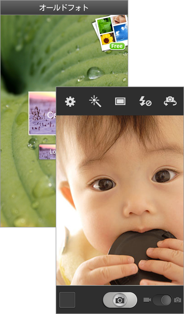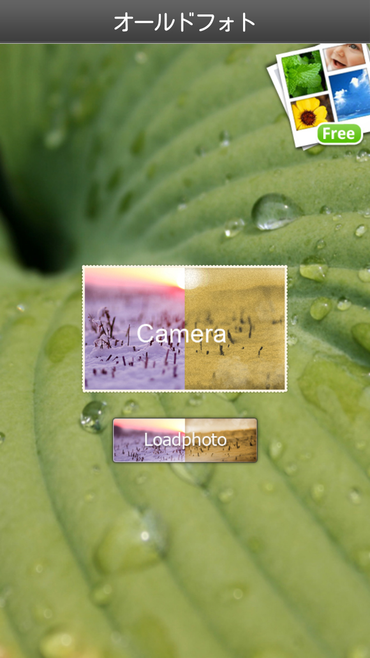 「Old Photo」を起動すると、[Camera] [Loadphoto]というメニューが表示されます。[Camera]をタップすると、インストールされている撮影機能付きのカメラアプリが表示されるので、アプリを選択して撮影しましょう。スマートフォンに保存されている写真を使う場合は[Loadphoto]をタップして、アルバムなど写真管理アプリを選択後、加工したい写真を選んでください。