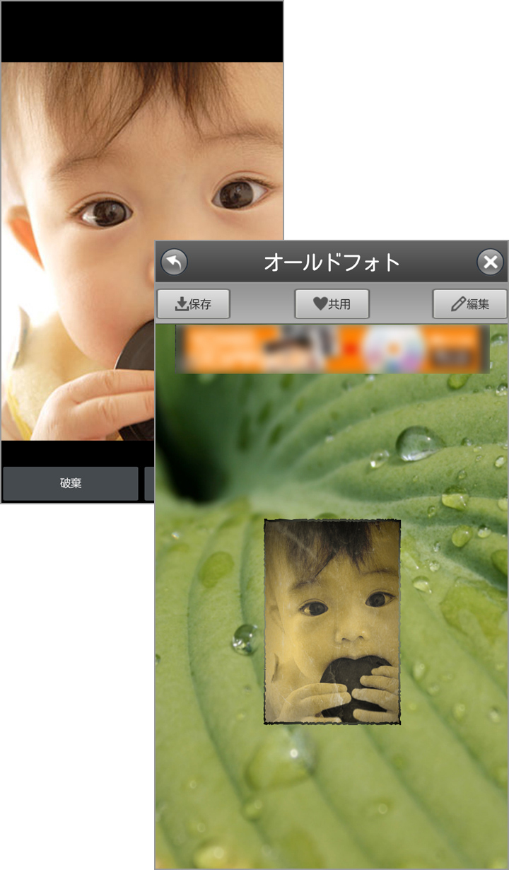 今回は[Camera]で写真を撮影してみましょう。撮影後、プレビューと[破棄][保存]が表示されるので、その写真を使う場合は[保存]をタップしてください。[保存]をタップ後、すぐにアプリが古ぼけたレトロ風の写真に加工して表示してくれます。他の写真加工アプリによくあるフィルターやエフェクトの選択などは無く、自動的に加工されます。加工後の写真は、起動後のメニュー画面に引き続き、緑の葉の背景の上に表示されます。撮影サイズによって変わるようですが、画面全体に表示されることはなく小さめなので、少し確認しづらいかもしれません。