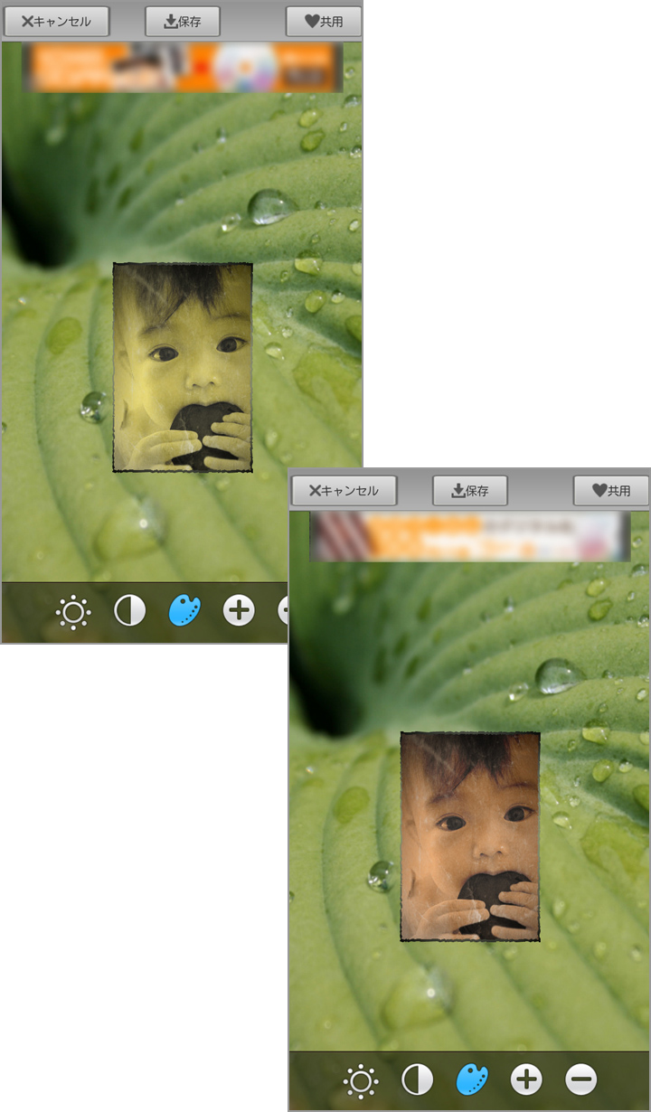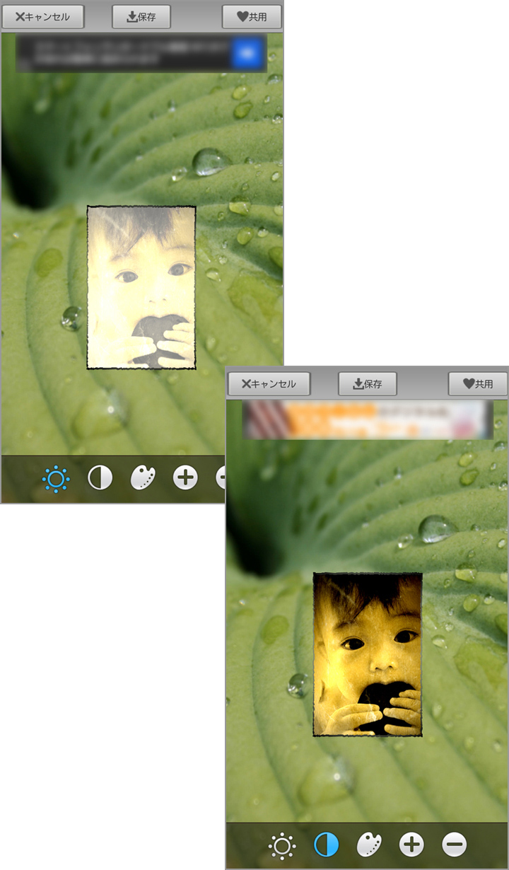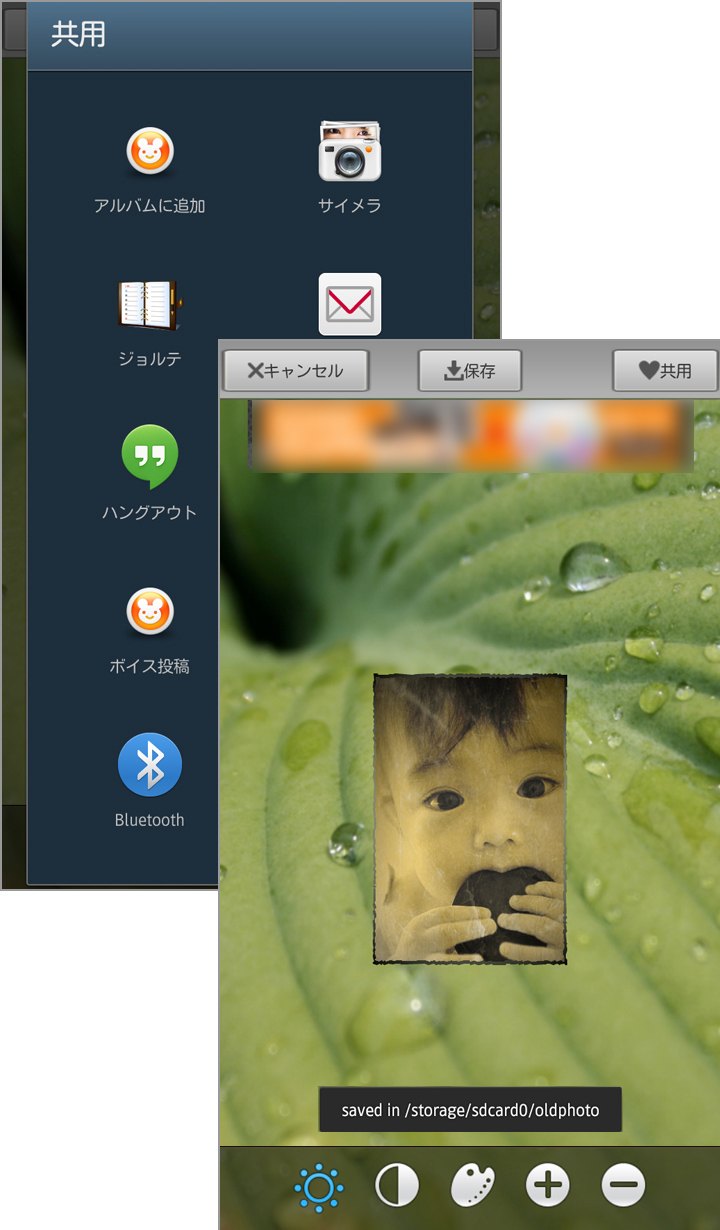 プレビュー表示された加工をすぐに保存する場合は、画面左上の[保存]をタップするだけで完了です。画面右上の[共用]をタップすると、他のアプリに共有することができます。