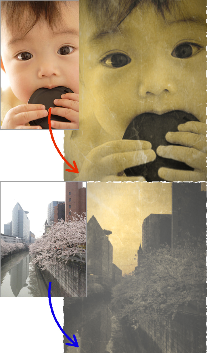 右側の画像が、アプリ側で自動加工したままの人物写真と、[明るさ][コントラスト][カラー]を編集した風景写真と、それぞれの元の写真です。人物写真は、自動加工でもメリハリがあって良い雰囲気に仕上がりました。風景写真は[明るさ][コントラスト][カラー]を編集することで、よりレトロな風合いに仕上げることができました。あまり細かな調整はできませんが、編集機能を上手く使って、好みの写真に加工してみましょう。