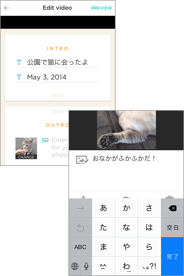 スタイルと曲を選択したら、画面右上の右矢印[→]をタップすると、[Edit video]の画面に進みます。[INTRO]では、スライドショーのスタート画面に表示するテキストを設定できます。初期表示は、一行目には[My Video]というテキストと、二行目には[May 12.2014]という、選んだ写真の撮影日です。編集したい行をタップすると、テキスト入力の画面になりますので、好きなテキストを入れましょう。日本語もOKです。