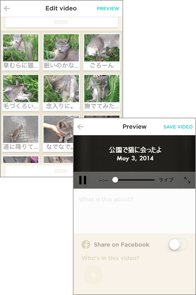 プレビューを観て、問題なければ、画面右上の[SAVE VIDEO]をタップしましょう。修正したい場合は、画面左上の左矢印[←]をタップしてひとつ前の画面に戻ります。