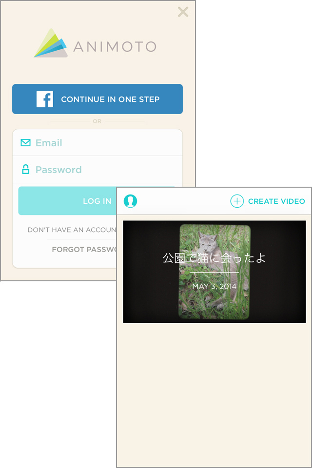 [SAVE VIDEO]をタップすると、ログイン画面が表示されます。Facebookのアカウントでログインするか、[SIGN UP]をタップして、「Animoto」のアカウントを作成しましょう。アカウント名・メールアドレス・パスワードを設定して、[SIGN UP]をタップするだけの簡単登録です。