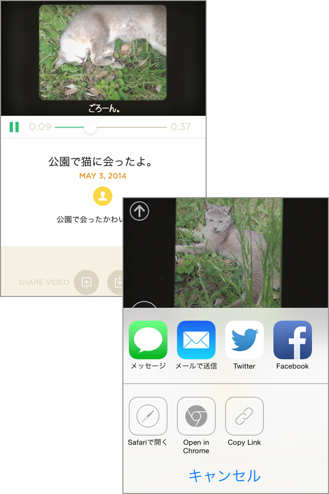ログイン後の画面に、作成したスライドショーが保存されます。スライドショーのタイトル画面をタップすると、再生画面が表示されます。画面下部の[SHARE VIDEO]をタップすると、共有メニューが開きます。共有メニューには、[メッセージ][メールで送信][Twitter][Facebook]の他、[Safariで開く][Open in Chrome][Copy Link]があります。ステキなスライドショーができたら、ぜひご家族やお友だちに共有して自慢してくださいね!