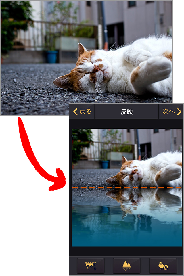 画面を二本指でタッチすると、中央にオレンジ色の点線が表示されます。ピンチイン・ピンチアウトで、反射の位置(上下の幅)を変更できます。ピンチインすると、上下の写真が近づき、ピンチアウトすると、離れます。人物や動物の足の位置など、地面に接している部分をぴったりくっつけると綺麗に見えますよ。