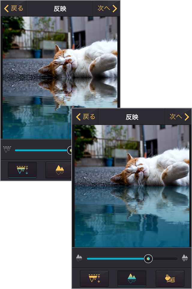 このように、「Reflection」を使えば、どんな写真でも水面に映っているような美しい写真に仕上げることができます。動物や人物の写真は、水面に接しているように見せるため、足元ギリギリの位置に水面を調整するのがコツです。この猫写真のように寝転んでいる写真なら、身体が地面に接している場所を中央にすると良いバランスになりますよ。