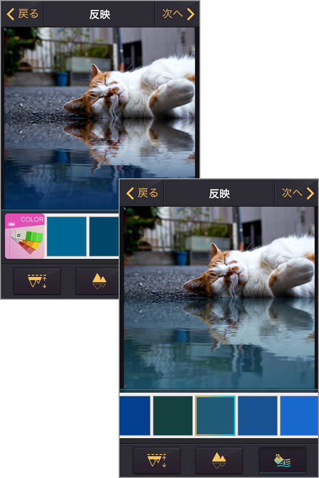 画面右下のボタンでは、水の色を変えることができます。画面右下のボタンをタップすると、[COLOR]のサンプルが表示されます。カラーサンプルをタップすると、画面でプレビューを確認することができます。カラーは青系で12色用意されているので、プレビューを見ながら、被写体のイメージに合う色を選んでくださいね。