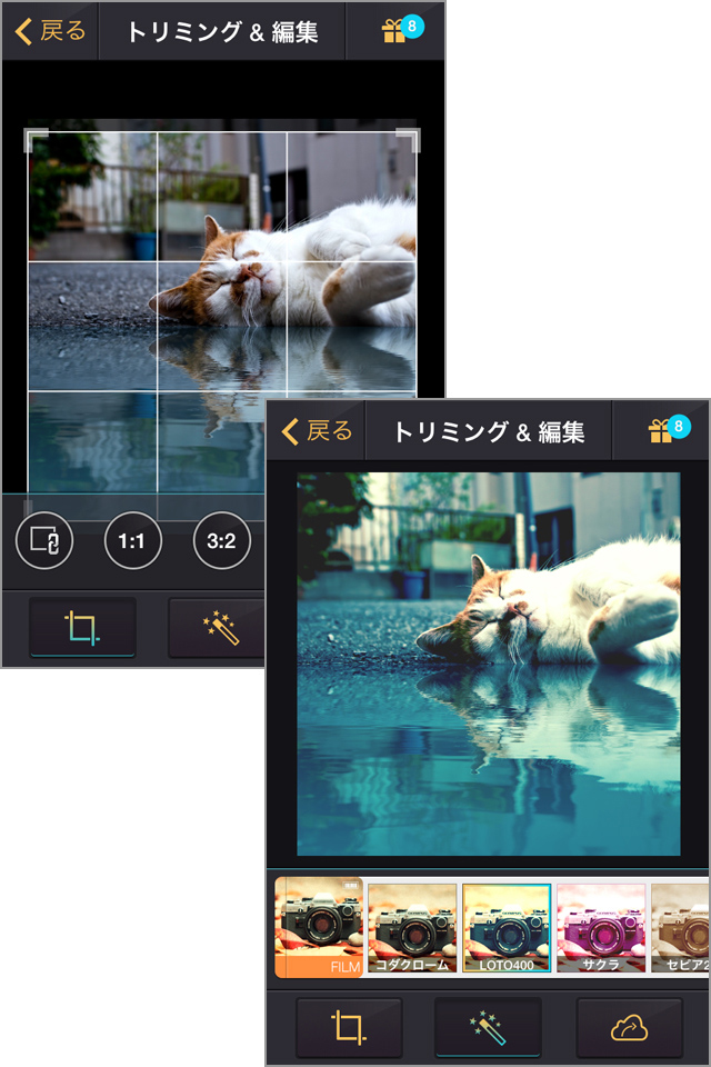 水の位置、水の色の濃淡、水の色を調整し終わったら、画面右上の[次へ]をタップしましょう。[トリミング&編集]の画面が表示されます。画面左下のボタンをタップすると、トリミングのメニューが表示されます。元のサイズの他に、[1:1][3:2][4:3][5:4]から比率を選ぶことができます。比率をタップした後、画面に表示される枠に合わせて写真を上下左右に動かして位置を決定しましょう。