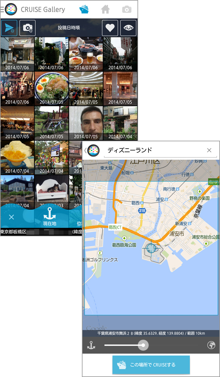 [地図検索を]試してみましょう。検索欄に表示させたい場所の名前を入力すると、地図が表示されます。地図をピンチイン・ピンチアウトすると、地図範囲を拡大・縮小移動することができます。表示された地図の下部の[この場所でCRUISEする]をタップすると、その地図付近で撮影された写真の一覧が表示されます。