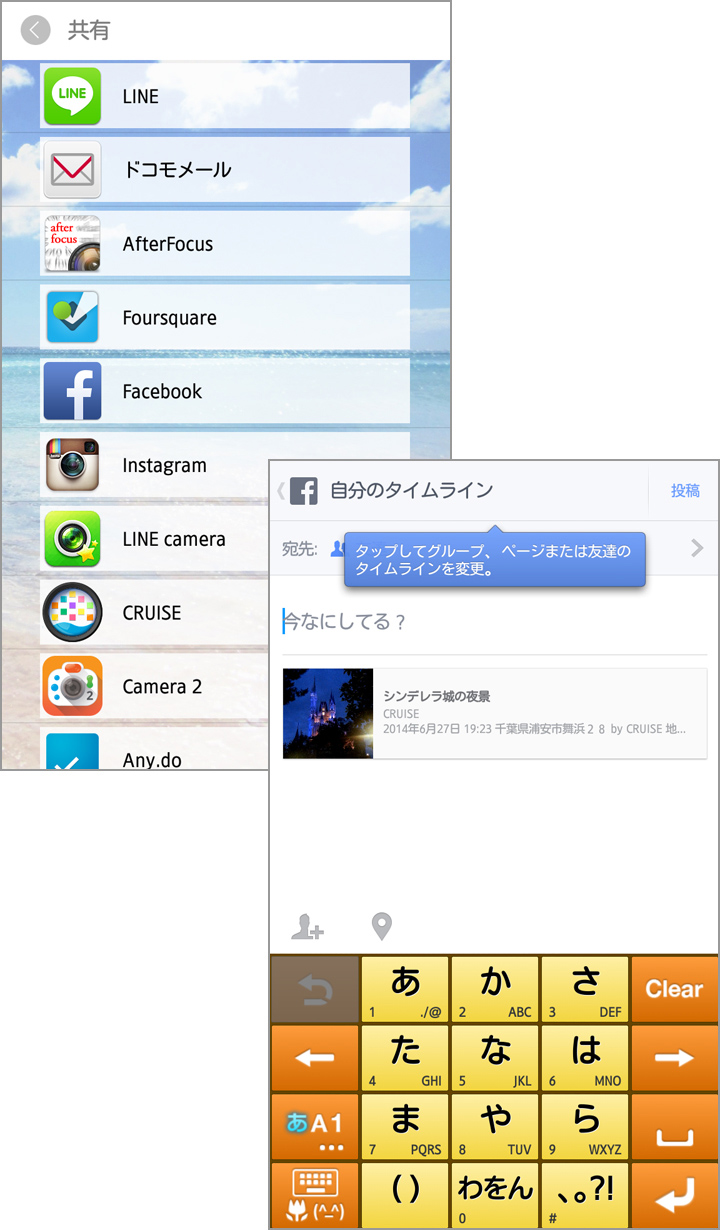 例えば、アプリ一覧から[Facebook]を選択すると、タイムラインへの投稿画面が表示されました。「CRUISE~フォトナビゲーション」からの共有だとわかる形での投稿となっています。他のユーザーが撮影したステキな写真を、他の人にも紹介したいときに便利な機能ですね!