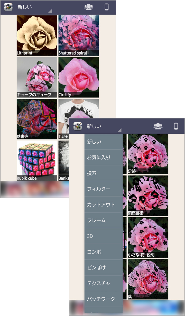 今回は、Android版で解説しますね。アプリを起動すると、エフェクト効果のサンプル一覧が新しい順に表示されます。エフェクト効果は約220種類。どれを選ぶか迷ってしまいますね。そんなときは、画面左上に表示されている[新しい]をタップすると、[フィルター][カットアウト][フレーム][3D][コンボ][ピンぼけ][テクスチャ][パッチワーク][ブラシ]というカテゴリを選ぶことができ、カテゴリごとに効果を確認できます。