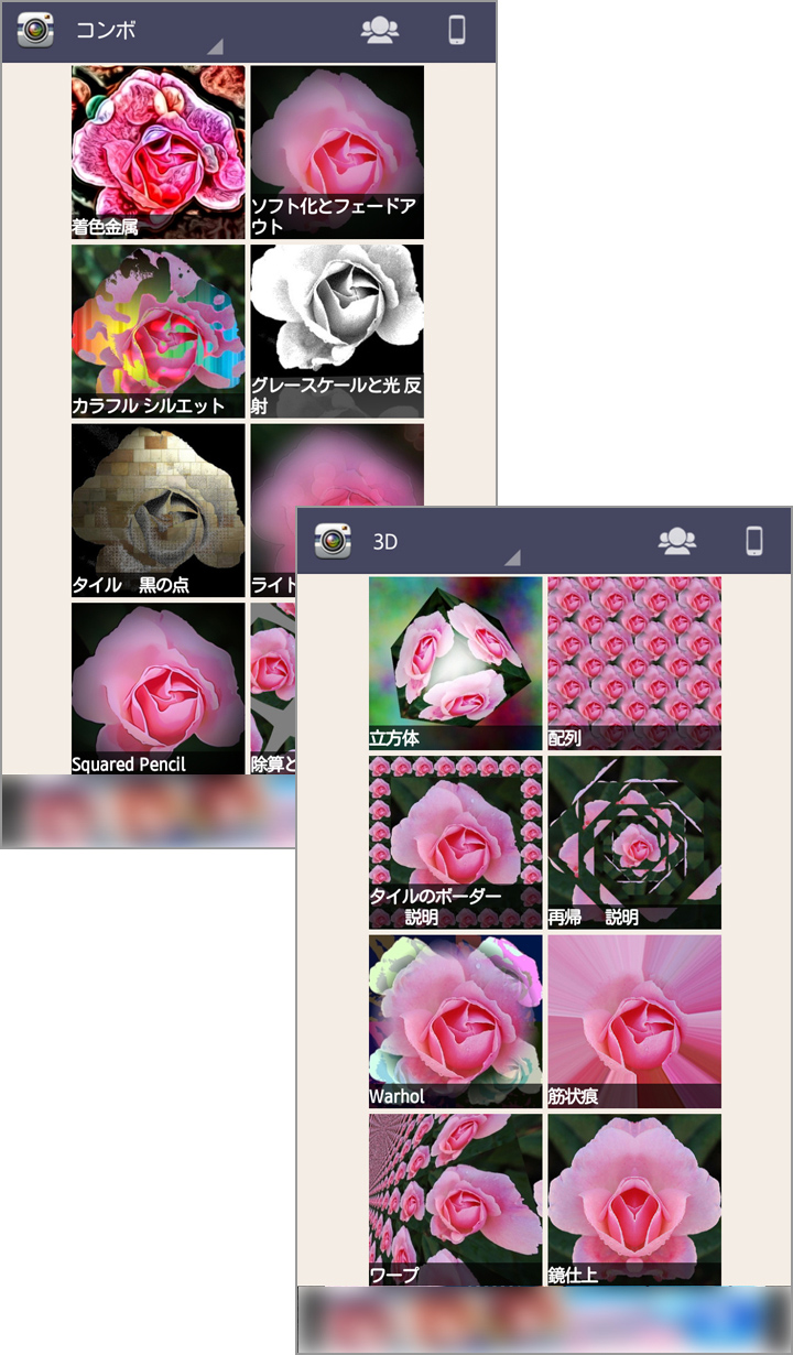 それぞれのカテゴリには10~30種類の効果が登録されています。例えば[3D]のカテゴリには、写真が立方体の3面に表示される[立方体]、タイル状に配列される[タイルのボーダー][タイル 遠景][配列]などがあります。