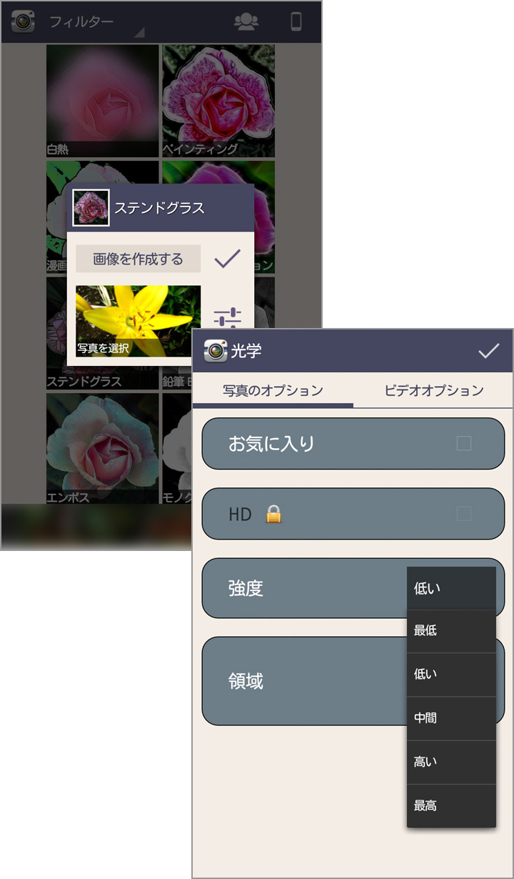 写真を選択して加工した後は、その他の効果を次々に適用させることができます。サムネイルをタップすると、最初は写真を選択するボタンが表示されましたが、一度写真を選択した後は、選択した写真が表示されていますので、オプションを設定してチェックボタンをタップするだけで、すぐに加工することができます。同じ写真をいろいろな効果で加工したいときに便利な機能ですね。