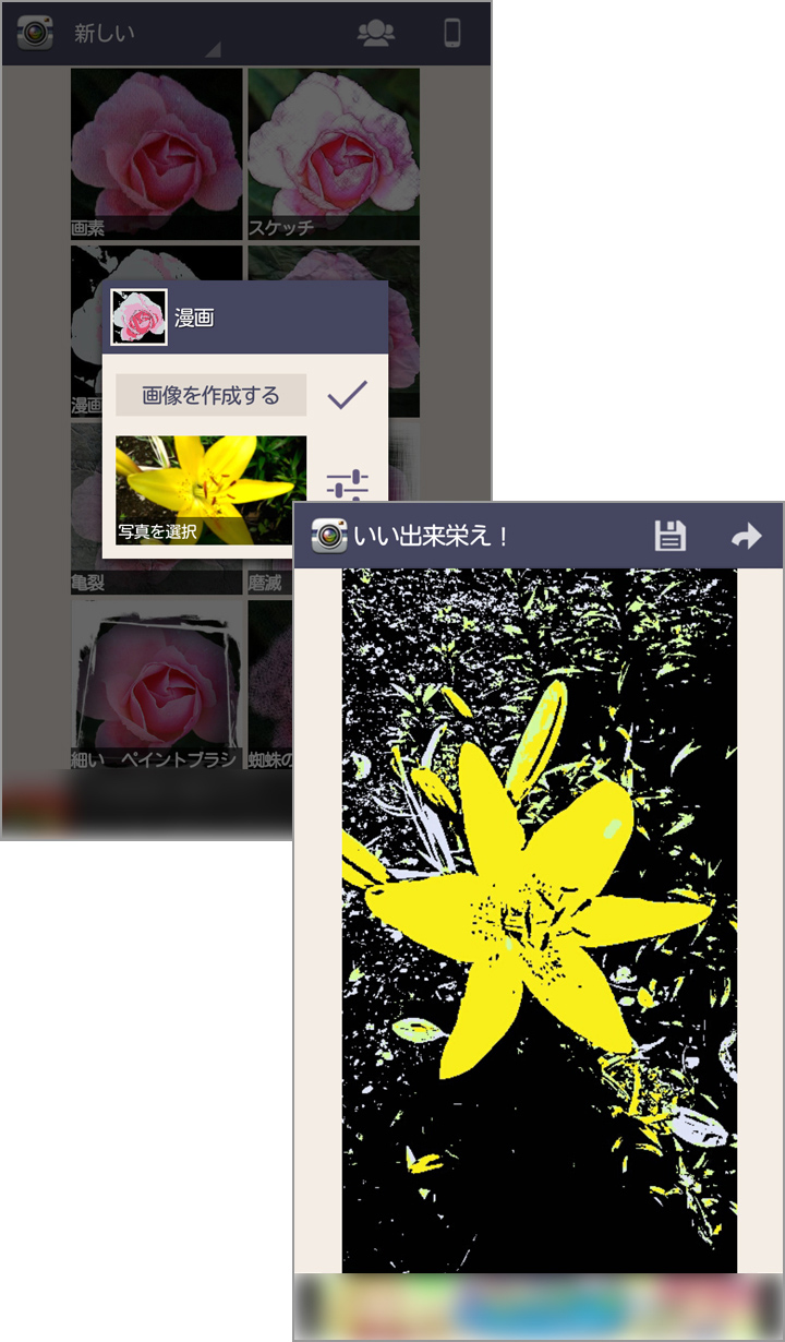オプション設定後、チェックボタンをタップすると、加工の処理が始まります。加工が終わると、効果が追加された写真が表示されます。画面右上の保存ボタンをタップすると、回転・シェア・ユーザーの作品を提出・壁紙にする、というメニューが表示されます。