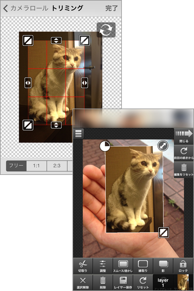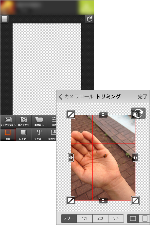 次に、画面下部の[レイヤー]をタップして、上に重ねる写真を選びます。背景と同じように[ライブラリから]または[カメラから]をタップして使う写真を用意し、トリミングを行います。上に重ねる写真は、後から余計な背景を削除する切り取りの作業を行うので、重ねたい被写体ギリギリまでトリミングをすると良いでしょう。