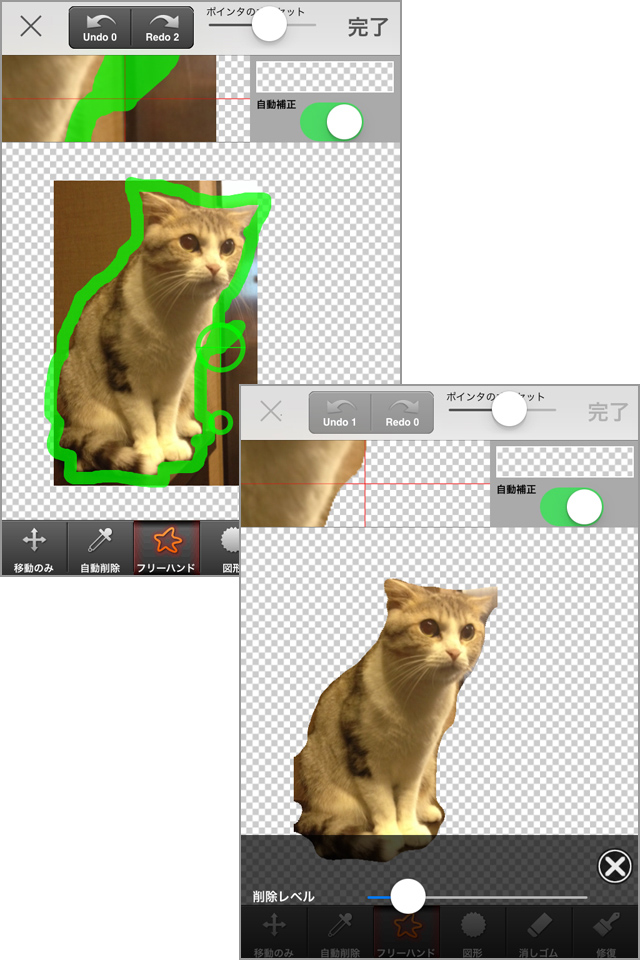 [フリーハンド]をタップすると、黄緑色のポインタが表示されます。このポインタを指で動かしながら、切り取りたい部分を残す形でざっくり囲みましょう。ポインタが指に隠れて操作しにくいときは、画面上部の[ポインタのオフセット]で指の位置と実際のポインタの距離を調整してみてください。囲み終わって指を画面から離すと自動で切り取られ、背景が削除されます。画面下部に表示される[削除レベル]のスライダーを左右に動かして切り取り範囲を調整することもできます。