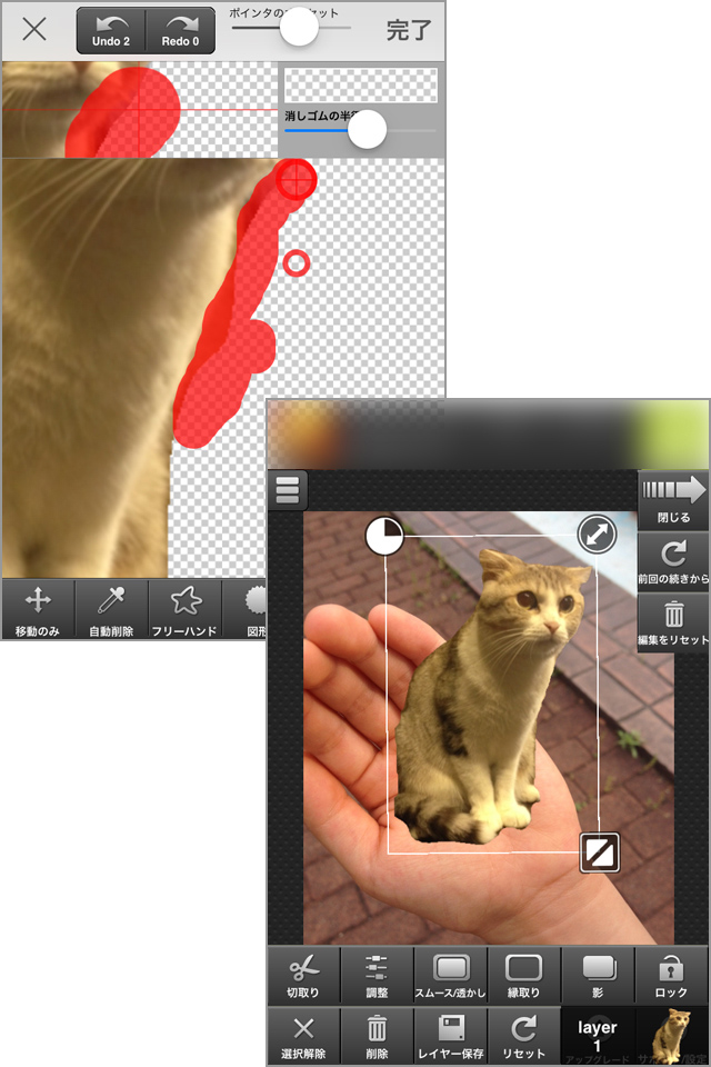 次に、重ねる写真の切り取りを行います。重ねる写真のレイヤーをタップした状態で、画面下部のメニュー[切取り]をタップします。切り取り画面が表示されたら、まずは画面下部のメニュー[フリーハンド]をタップしてください。