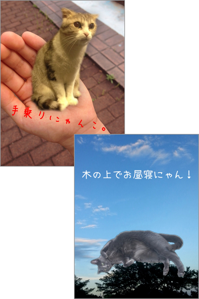 人物写真を撮影して、とても良い写りなのに背景がイマイチ……というようなことはよくありますよね。そんなときは、「合成写真スタジオ」を使って、綺麗な背景を合成しちゃいましょう!背景写真を選んで、上にかぶせる写真を切り取ると自然な合成写真を作ることができます。最大10枚まで写真を重ねることができ、重ねた写真の縁を自然にぼかしたり影をつけたり、テキストを追加するなどの機能もあるスグレモノです!