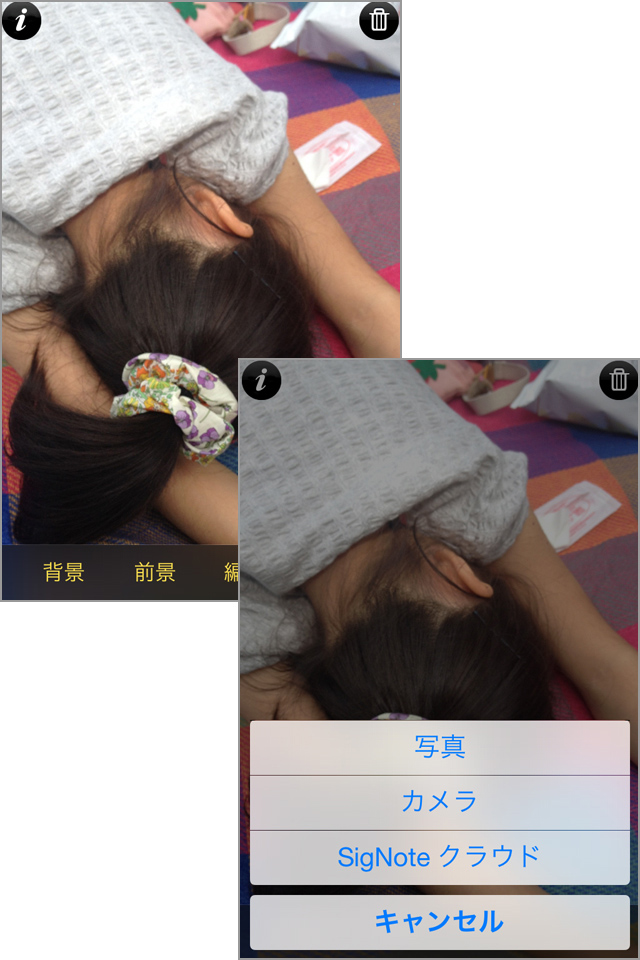 用意した写真が、背景として画面に表示されました。次に、この写真に合成したい手描きの絵や文字を選びましょう。画面下部のメニュー[前景]をタップすると、[写真][カメラ][SigNote クラウド]というメニューが表示されます。