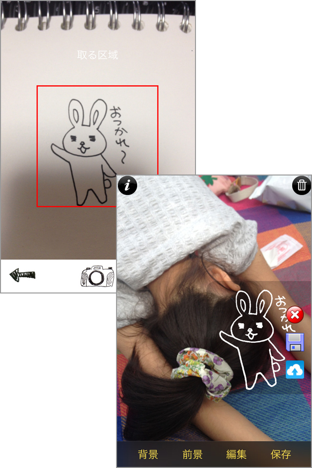 それでは、手描きのイラストを撮影して使ってみましょう。[カメラ]をタップすると、[取る区域]という赤い正方形が表示されるので、用意したイラストを撮影しましょう。絵や文字は、白紙の上に黒で描くと良いですね。「SigNote」が自動的に線を抜き出して背景写真の上に合成してくれます。初期表示では線の色は白です。