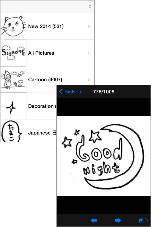 [前景]をタップして、[SigNote クラウド]を選択すると、カテゴリごとにアイテムが表示されます。カテゴリをタップすると、アイテムのサムネイルが表示されるので、気に入ったアイテムをタップすると、拡大表示されます。画面右下の[使う]をタップすると、背景に合成されます。