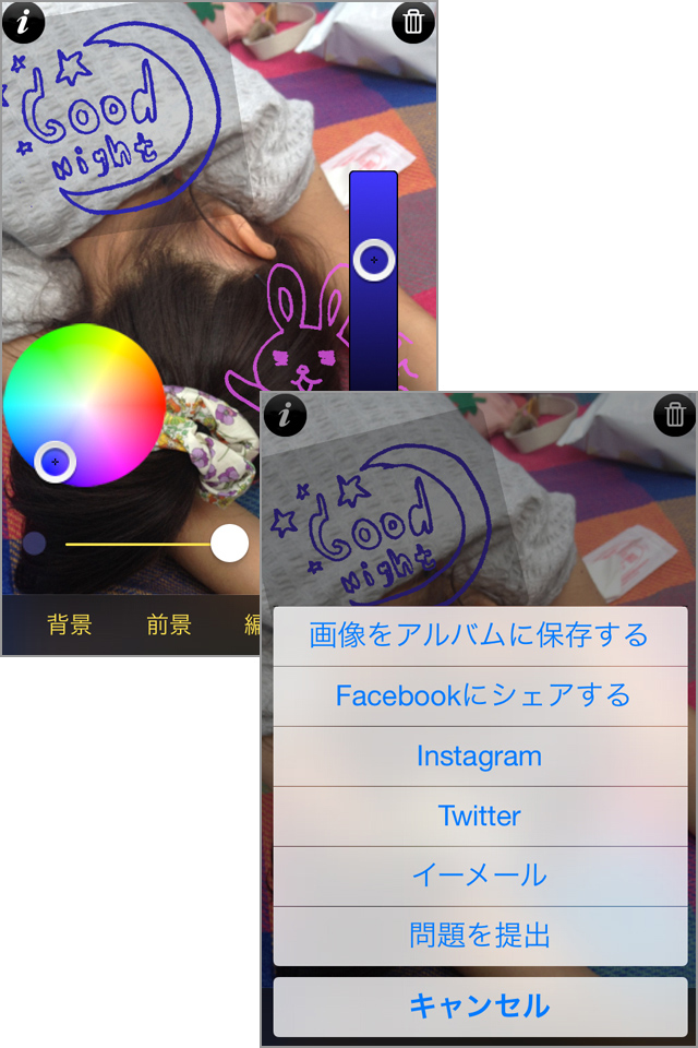 調整が終わったら、画面下部のメニュー[保存]をタップして、保存しましょう。[画像をアルバムに保存する]をタップすると、スマートフォンに保存されます。[Facebookにシェアする][Instagram][Twitter][イーメール]で、お友だちやご家族にシェアすることもできます。