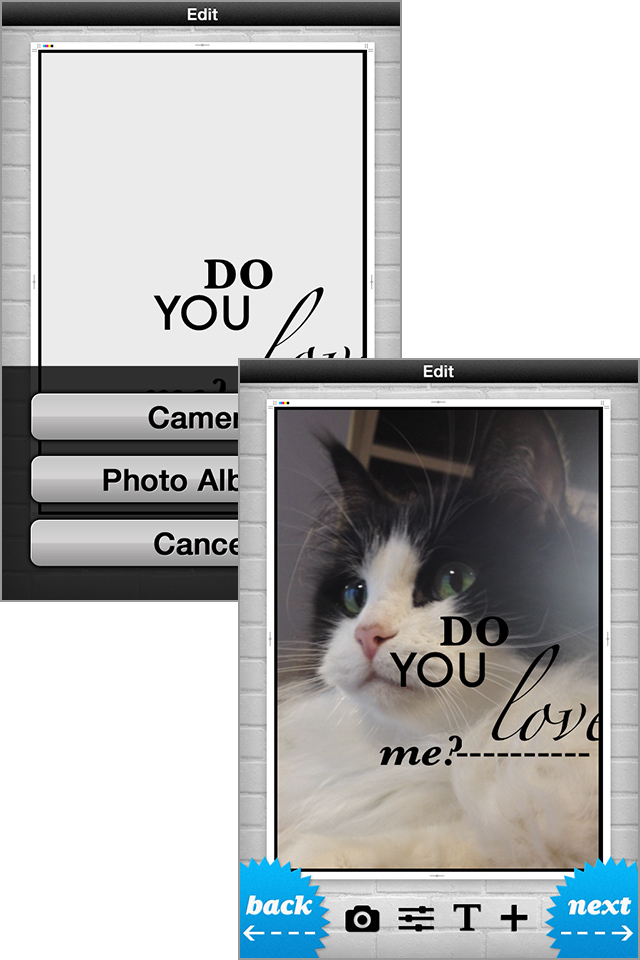 [Camera]または[Photo Albums]をタップして写真を用意すると、テンプレートの画面に写真が取り込まれた状態の[Edit]画面が表示されます。