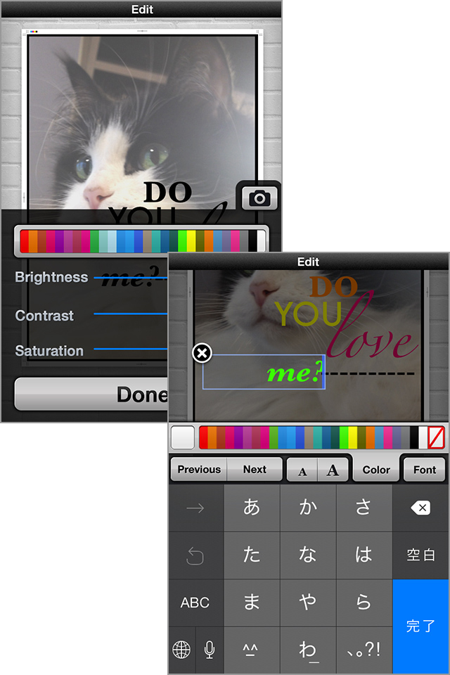 [Edit]画面では、テンプレートにあてはめた、元の写真の色調補正やテキスト、フィルターの編集ができます。画面下部の[スライダー]ボタンをタップすると[Image Adjustments]メニューが表示されます。写真の色調を、[Brightness][Contrast][Saturation]のスライダーで調整しましょう。上部のカラーパレットでは、写真の背景色を変更することができます。先ほどあてはめたテンプレートに合わせて、加工をしてみましょう。編集が終わったら、[Done]をタップしてください。