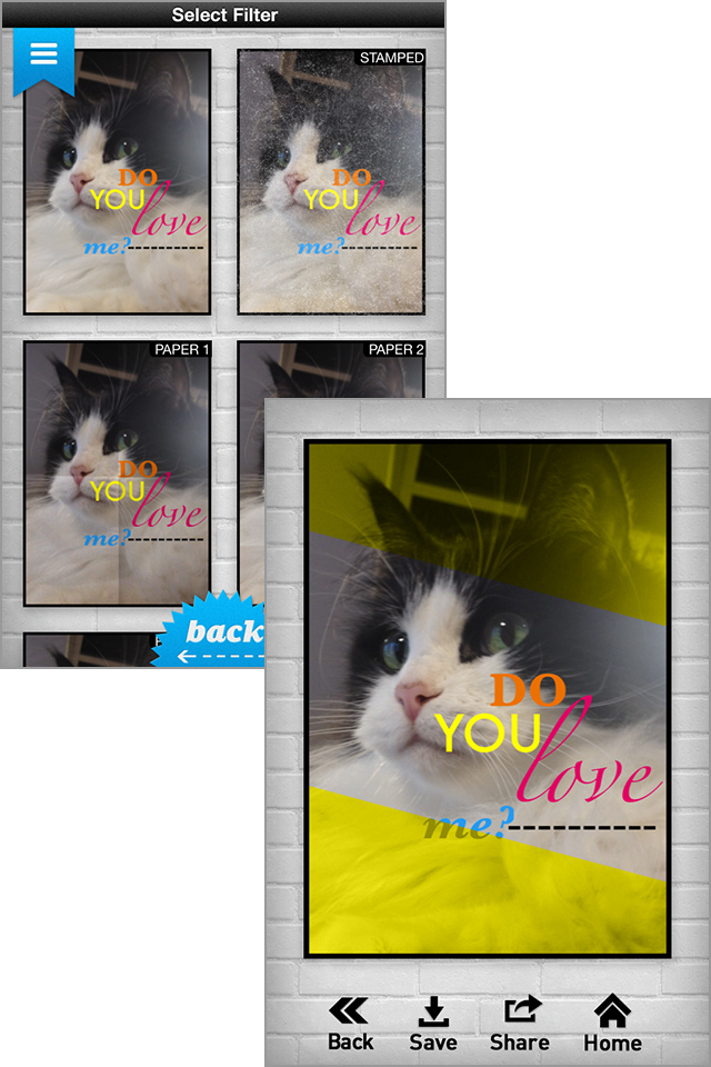 また、完成した写真を保存した後、[←back]で[Select Filter]の画面に戻って、別のフィルターを選ぶことができるので、同じ写真を使っていろいろなパターンの画像を作ることができますよ。右側の画像を見ていただくと、テンプレートとフィルターが違うだけでまったく印象が違う仕上がりになっています。