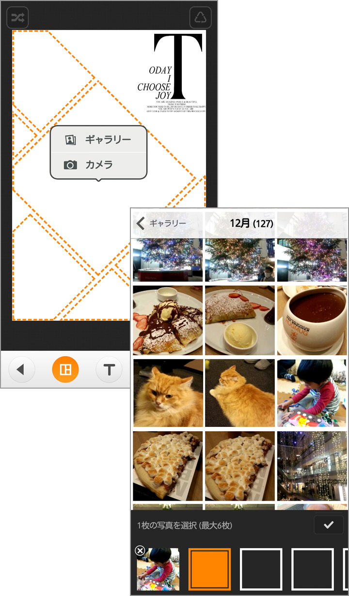 [タップしてください]という表示が出るので、タップしてみると、[ギャラリー][カメラ]を選択するメニューが表示されます。スマートフォンに保存されている写真を使う場合は[ギャラリー]、その場で撮影したい場合は[カメラ]をタップしましょう。[ギャラリー]をタップすると、スマートフォンに保存されている写真が一覧で表示されます。テンプレートごとに選択できる最大枚数が異なりますが、画面下部に現在選んでいる写真数と、そのテンプレートで選べる最大枚数が表示されるのでわかりやすいですね。