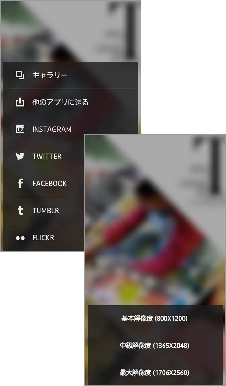 [マガジン]のテンプレートを使う場合は、写真を選んで写真効果をつけるだけで十分な仕上がりになるのが嬉しいですね。画面右下の共有メニューをタップすると、ギャラリー・他のアプリに送る・INSTAGRAM・TWITTER・FACEBOOK・TUMBLR・FLICKRの、各種アプリやSNSへの共有メニューが表示されます。スマートフォンに保存したい場合は[ギャラリー]をタップしましょう。写真の解像度を、基本解像度・中級解像度・最大解像度から選ぶことができます。