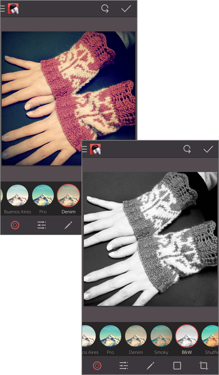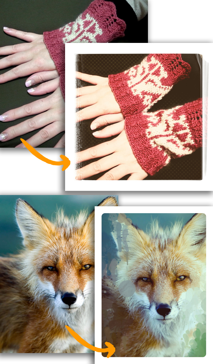 できあがった写真を見てみましょう。左側のハンドウォーマーの写真は、[Buenos Aires]のフィルタをもとに、明るさなどを調整し、 [Dotter]のエフェクトブラシで背景をなぞってドット加工し、[Book]のフレームを付けてみました。元の写真よりポップな印象に仕上がりました。