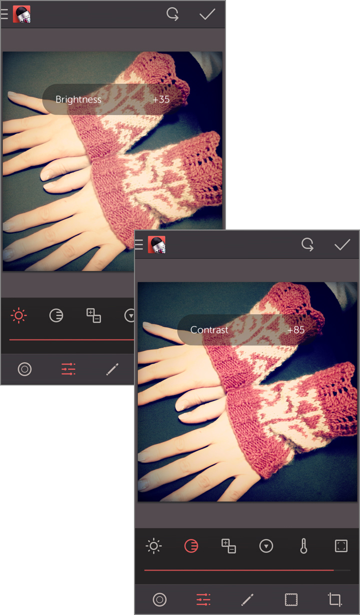 画面下部のメニュー、左から2番目のスライダーボタンをタップすると、画像調整ツールを使うことができます。画像調整ツールは6種類用意されています。左から、[Brightness(明るさ)][Contrast(コントラスト)][Saturation(彩度)][Vibrance(自然な彩度)][Temperature(温度)][Vignette(ぼかし)]です。ツールボタンをタップして選択したら、スライダーを左右に動かしてどのくらい適用させるのか自由に調整しましょう。左の写真は、[Brightness(明るさ)]を選択して、少し明るくしてみました。右の写真は[Contrast(コントラスト)]で、コントラストを強くして、色の濃淡を濃くしてみました。