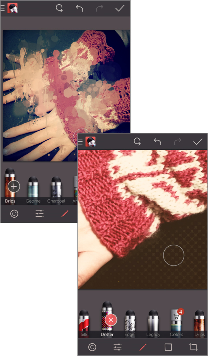 ブラシをタップすると選択されるので、写真をなぞってみましょう。なぞった部分にエフェクトがかかります。ブラシに[+]マークが表示されているものは、二度タップすると少し違った効果になります。効果が気に入らなかったら、画面上部の矢印ボタンをタップすることで、一つ前の画面に戻してやり直すことができます。