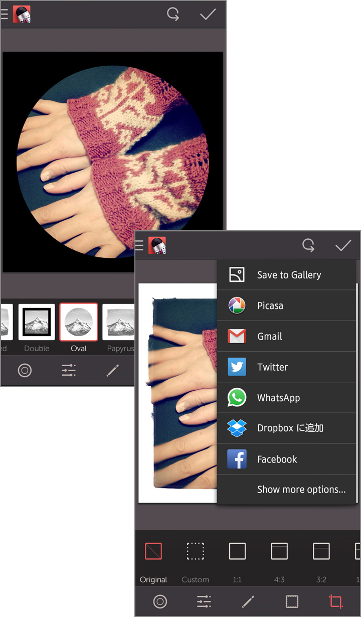 すべての編集が終わったら、画面右上のチェックボタンをタップしてください。保存と共有メニューが表示されます。[Save to Gallery]でスマートフォンに写真を保存でき、メールやSNS、その他アプリへの共有もできます。