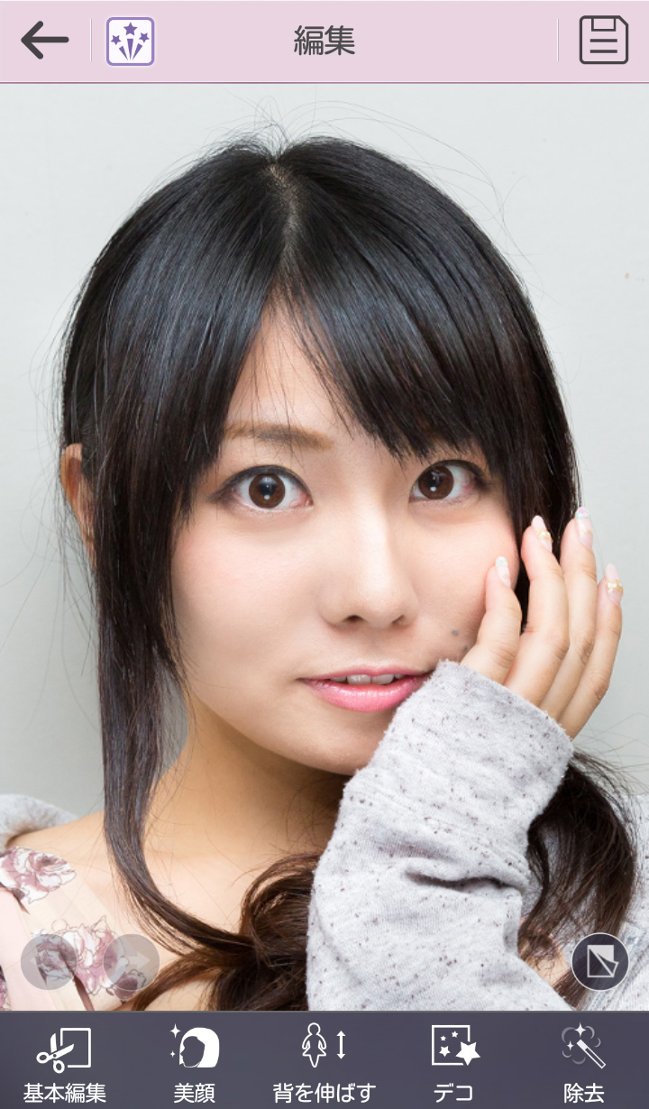 [編集]メニューには、写真の切抜きや回転ができる[基本編集]、美肌・小顔など顔を細かくレタッチできる[美顔]、全身が写っている場合に背を高くすることのできる[背を伸ばす]、エフェクトやフレームを加える[デコ]、背景など不要な部分を消せる[除去]があります。今回は自撮り写真をさらに美しく加工できる[美顔]機能を中心に使い方を見てみましょう。